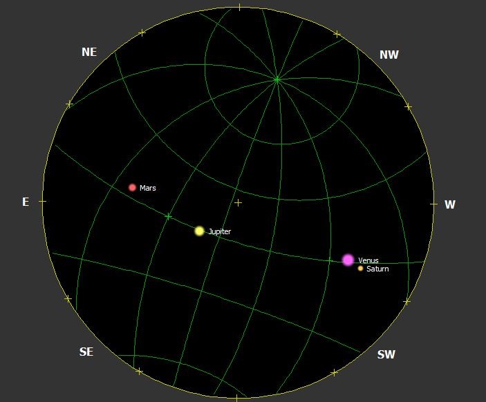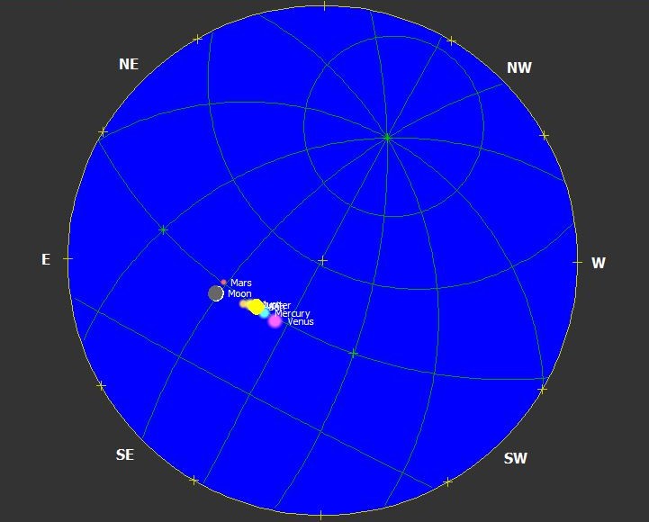 5 Mayıs 2000’de Türkiye saati ile 11:08' de Güneşin sağında ve solunda gökyüzünde 25 derecelik bir açı içerisinde aşağıdaki şekilde görüldüğü gibi toplanmışlardır. 31 Aralık 2024 'den itibaren Astronomik Tan’ın bitiminden sonra Mars, Jüpiter, Satürn ve Venüs gökyüzündeler ancak birbirine çok yakın konumda değiller. Bu birlikte oluşa bazı günler evresine göre Ay'da katılacak. 16 Şubat'a kadar bu birliktelikleri devam edip 16 Şubattan sonra Satürn Astronomik Tan'ın bitiminden biraz önce batmış olacağı için gecenin ilk saatlerinde gökyüzünü Mars, Jüpiter ve Venüs'e bırakacak.