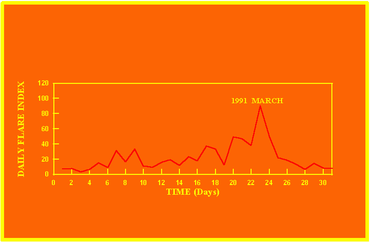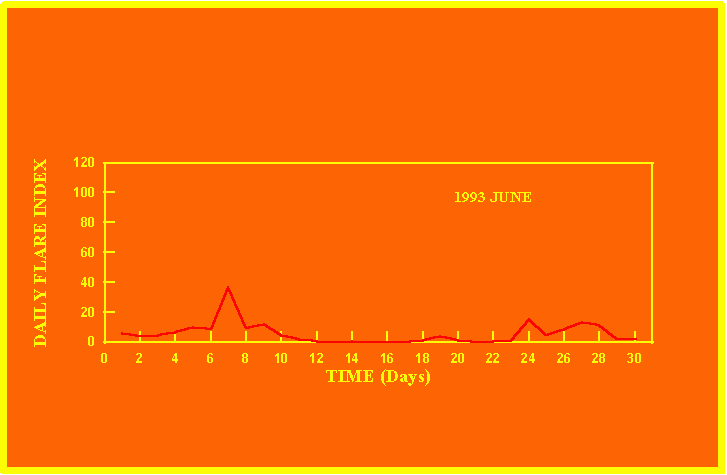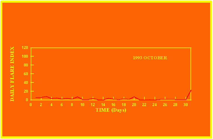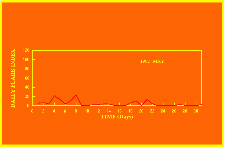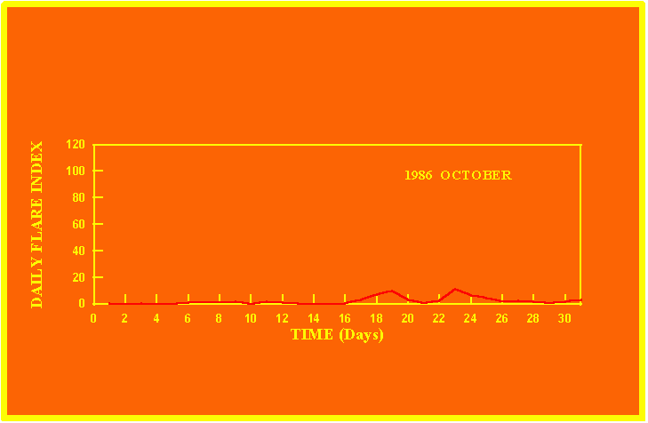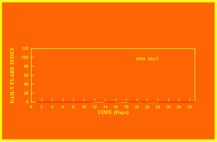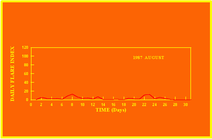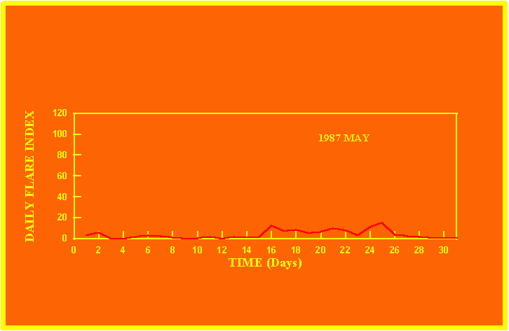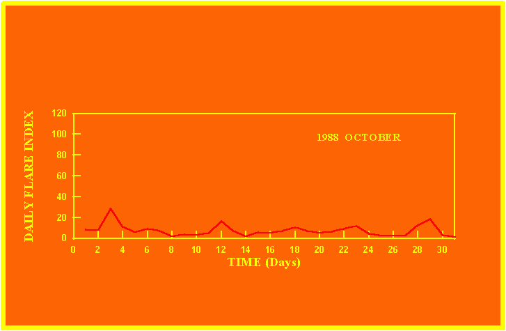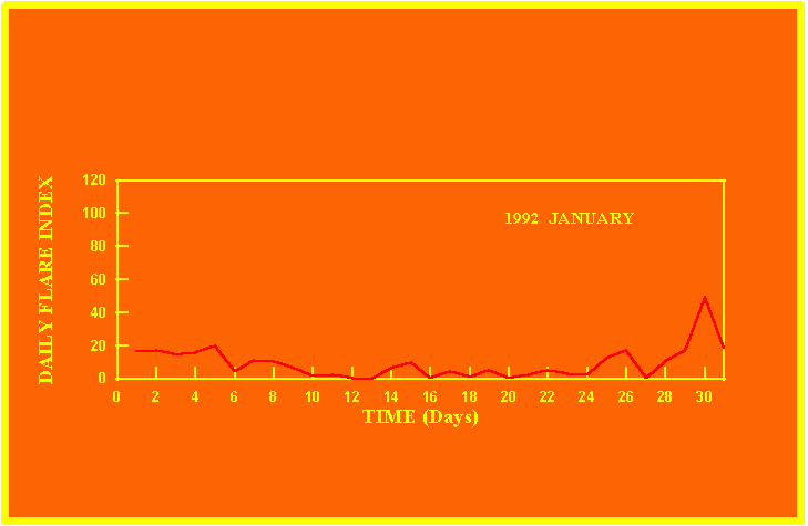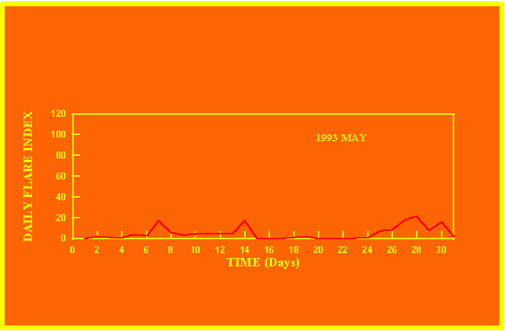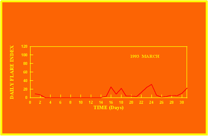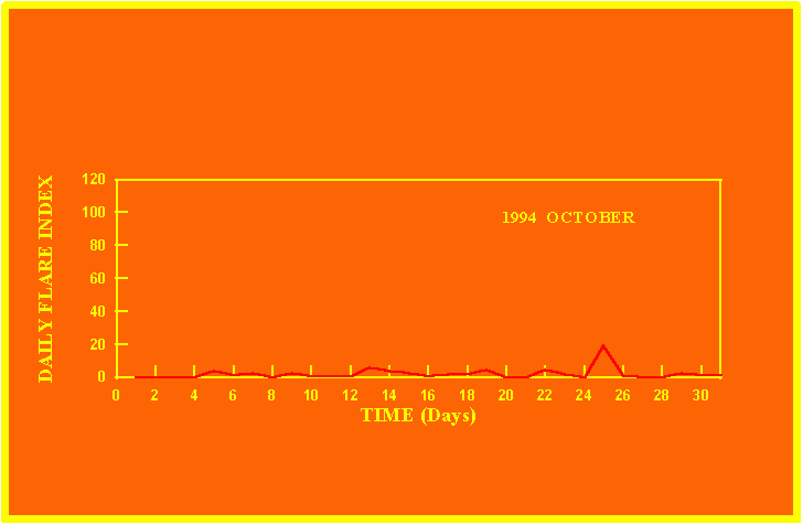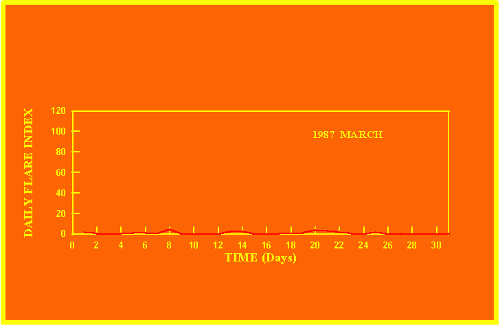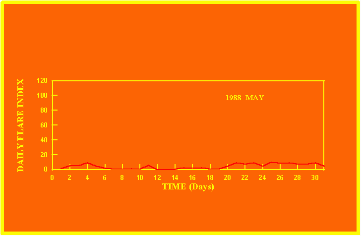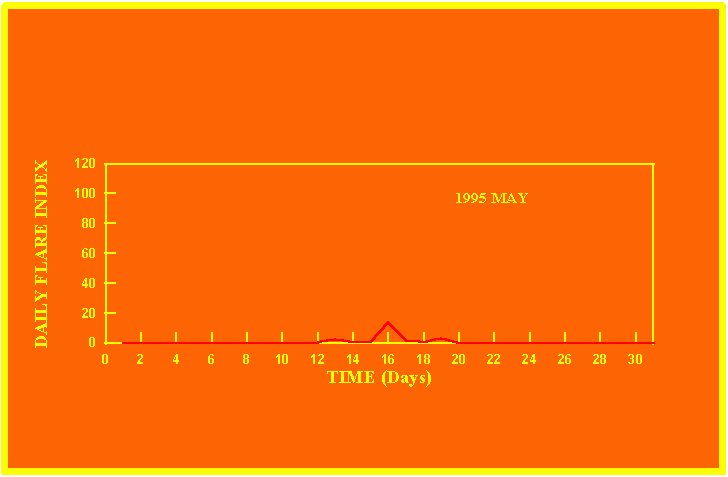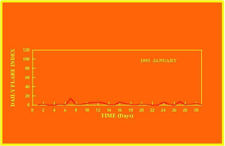 If the value of the daily flare index exceeds 20 once, then the color of that month is yellow.
