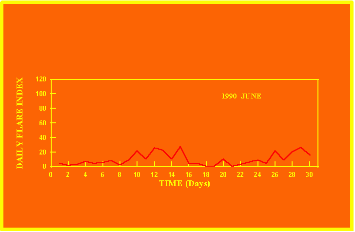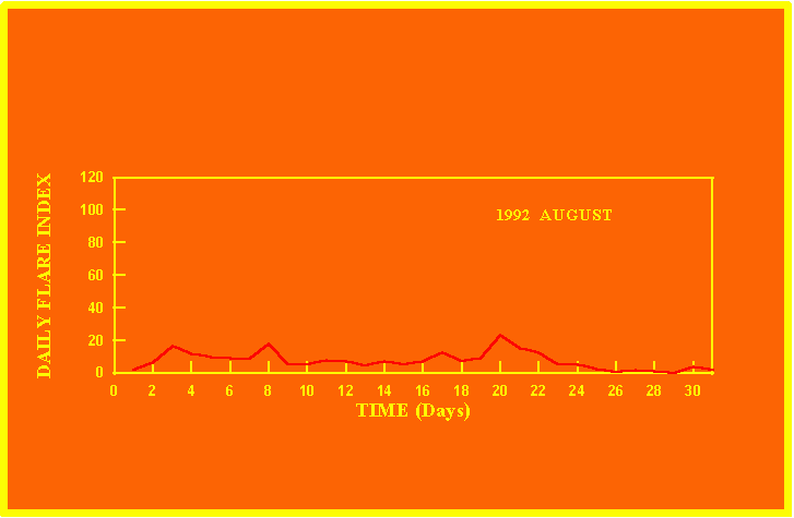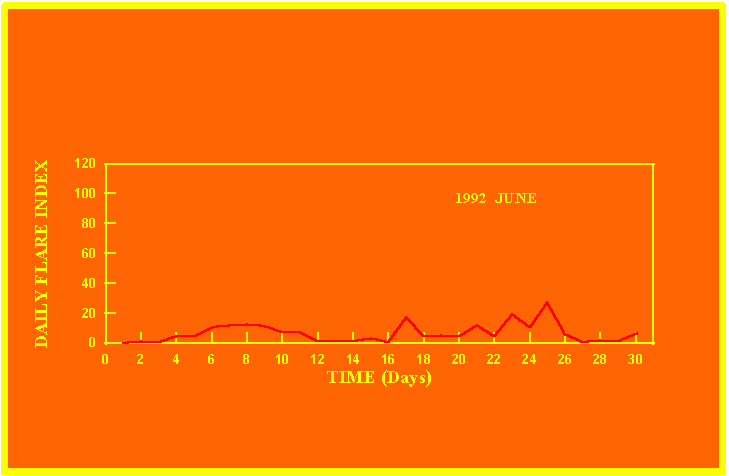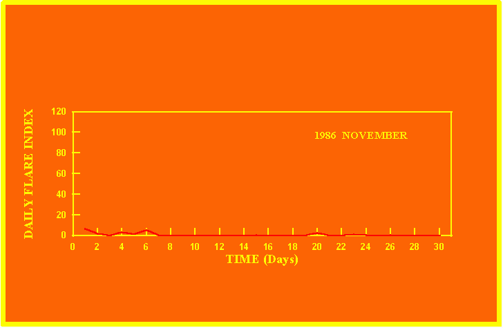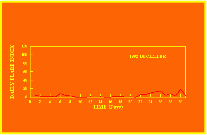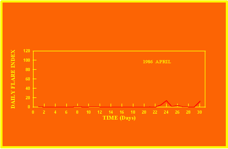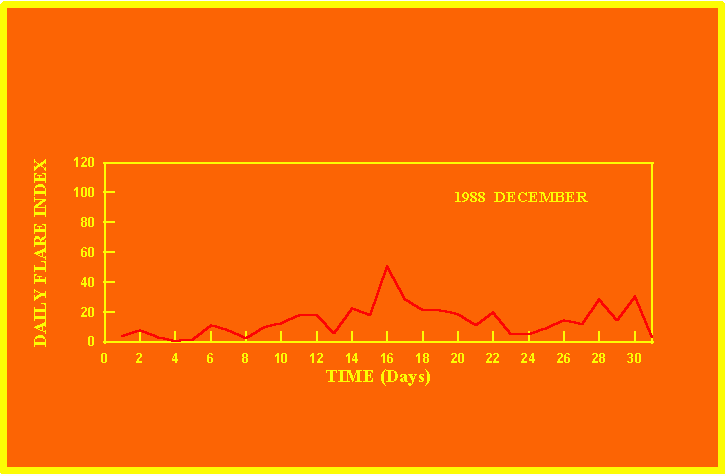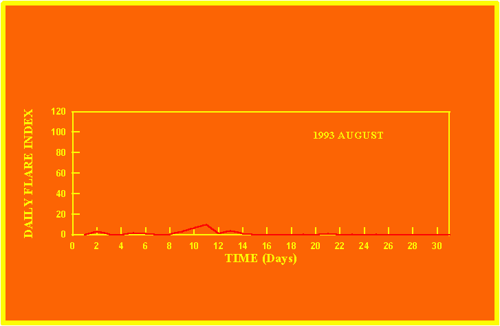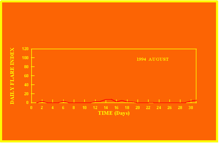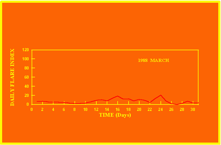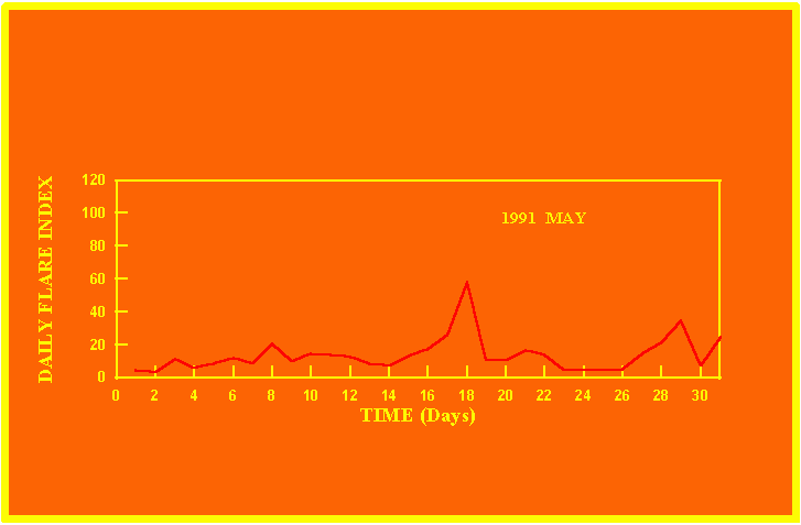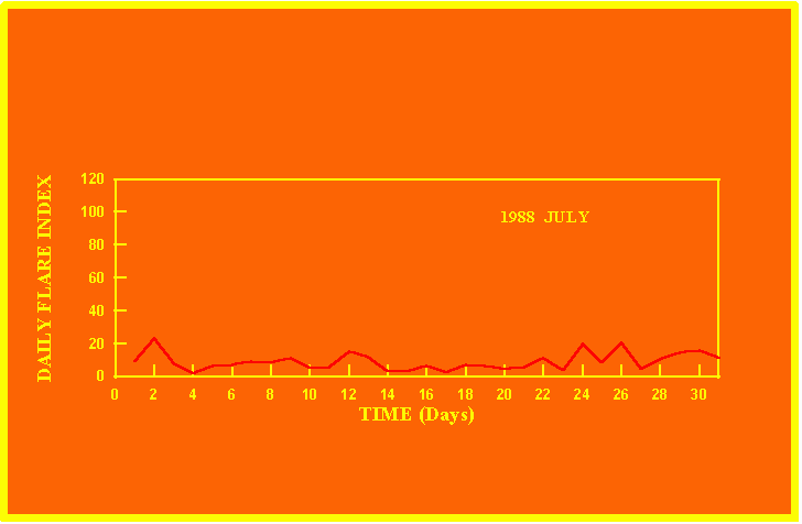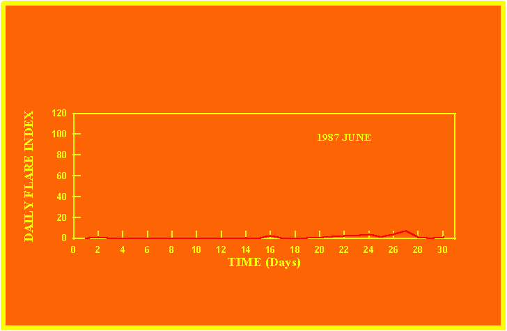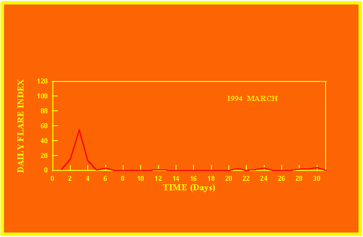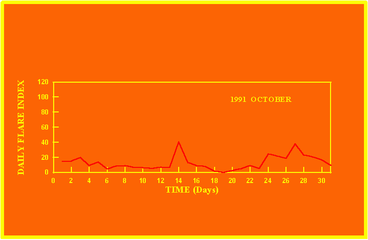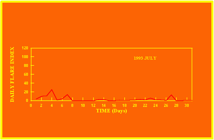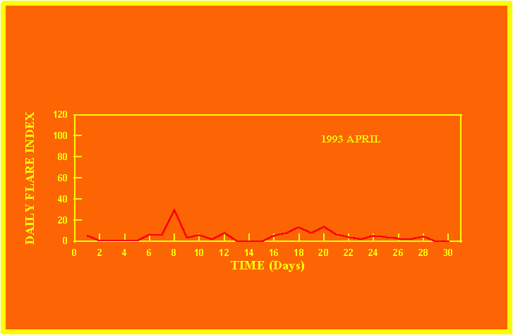 If the value of the daily flare index exceeds 20 once, then the color of that month is yellow.