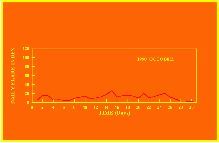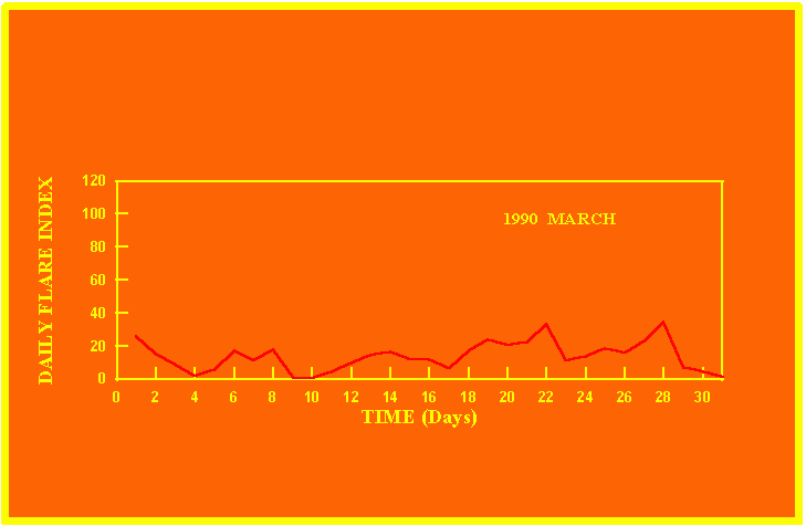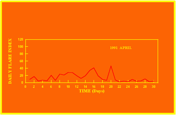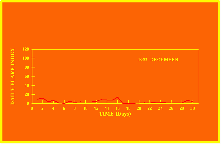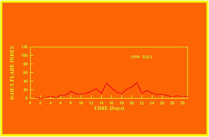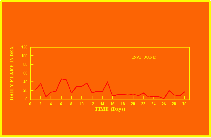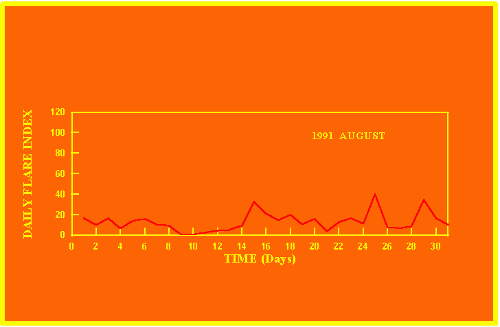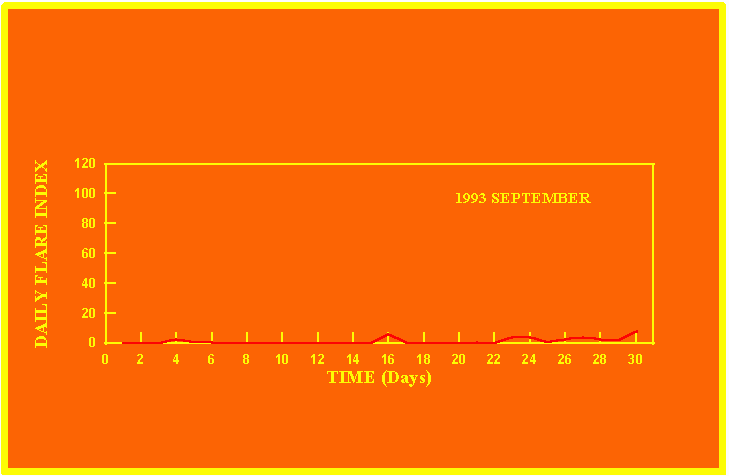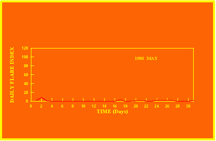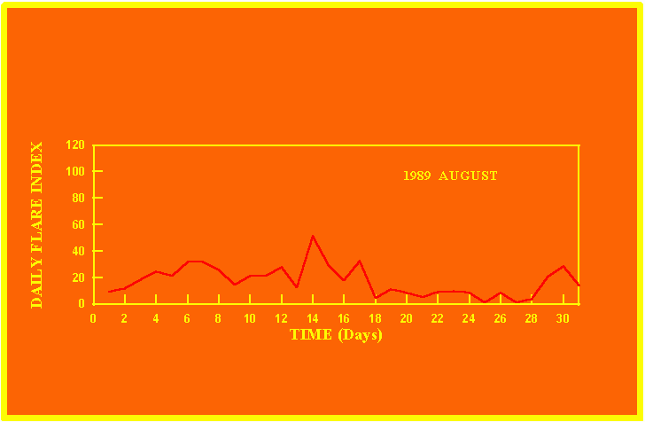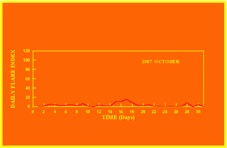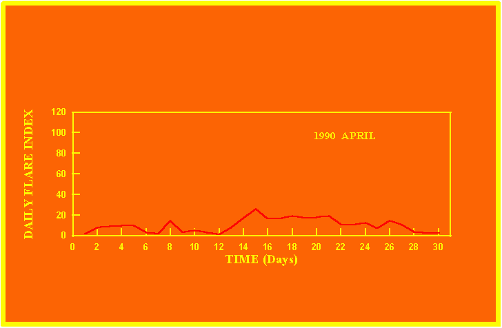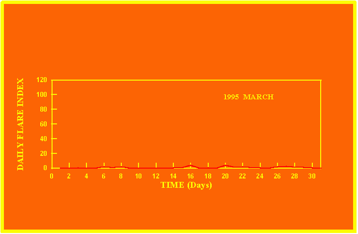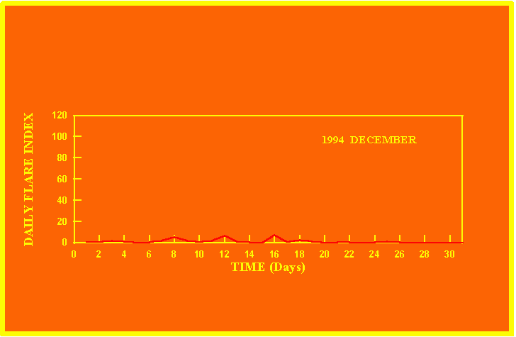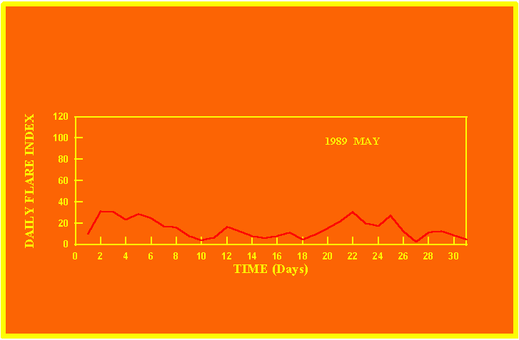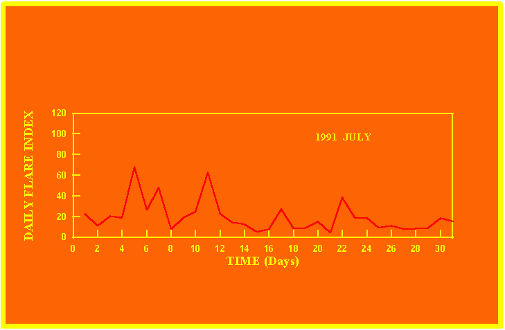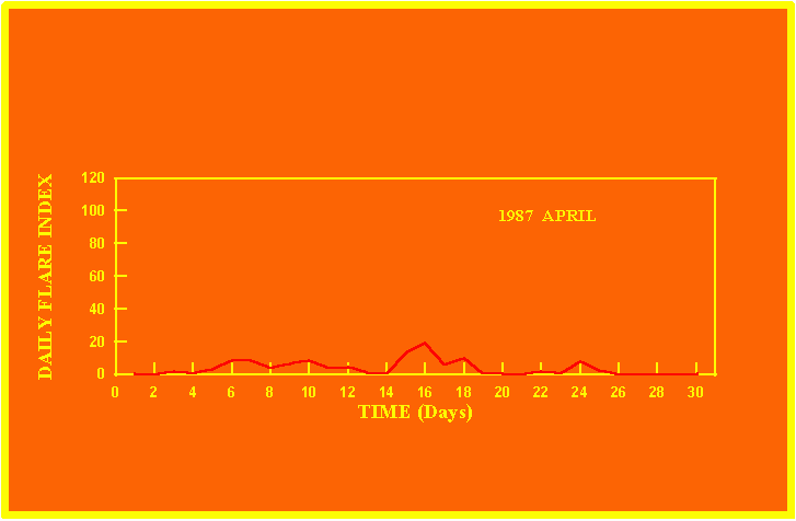If the value of the daily flare index exceeds 20 once, then the color of that month is yellow.