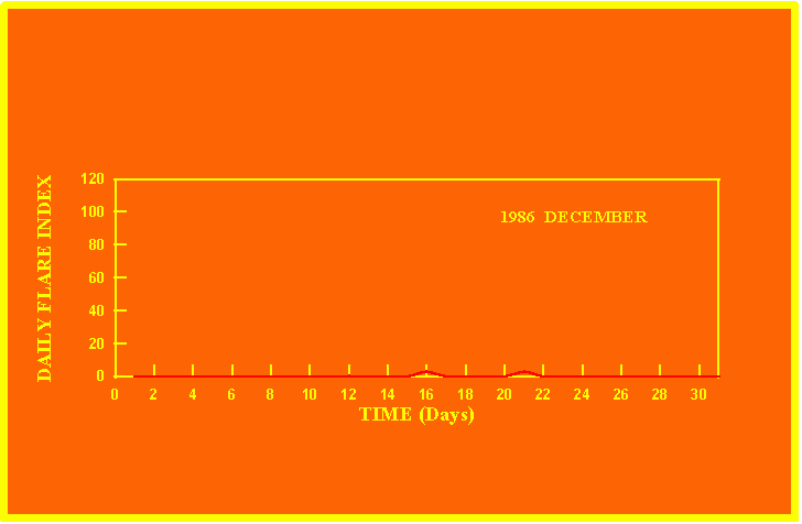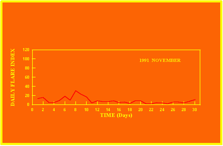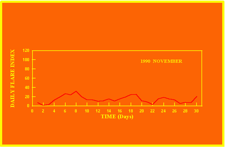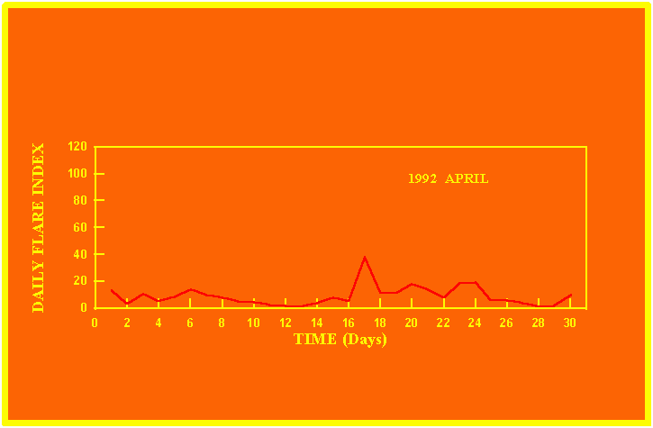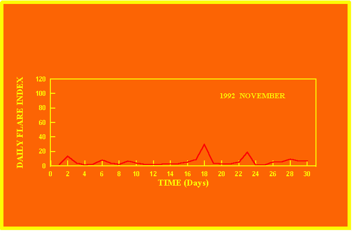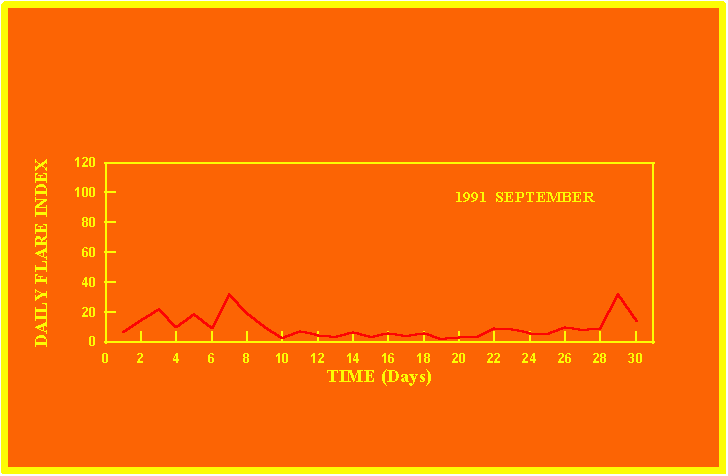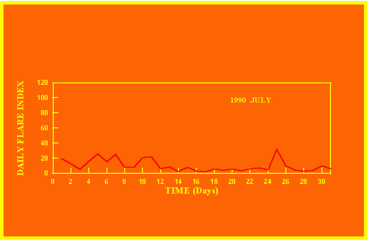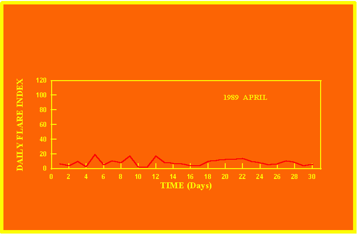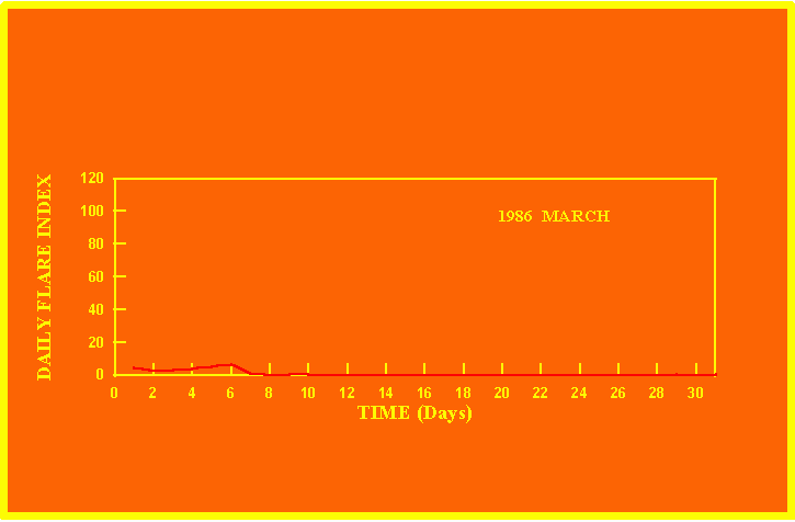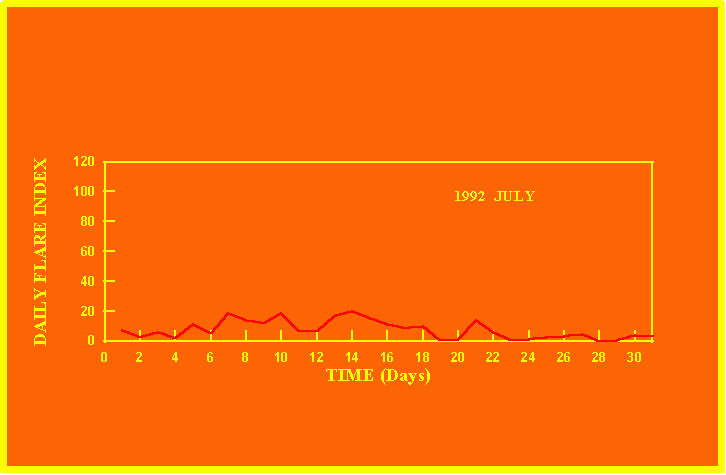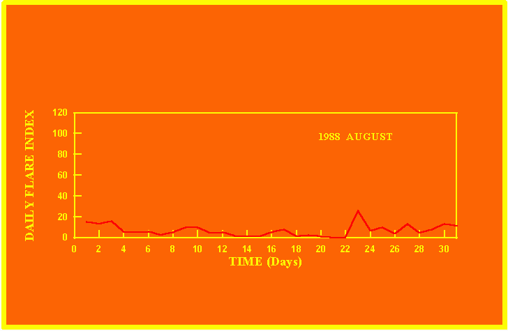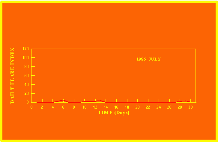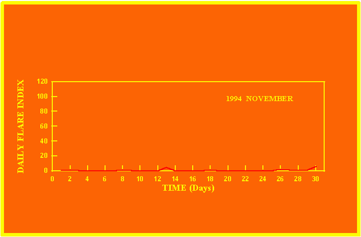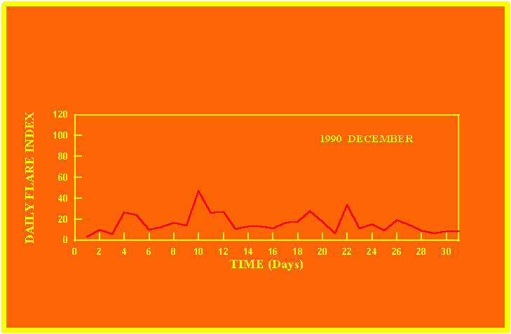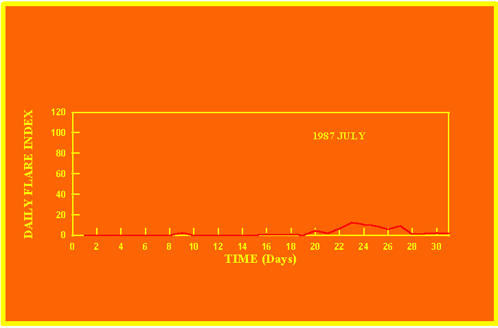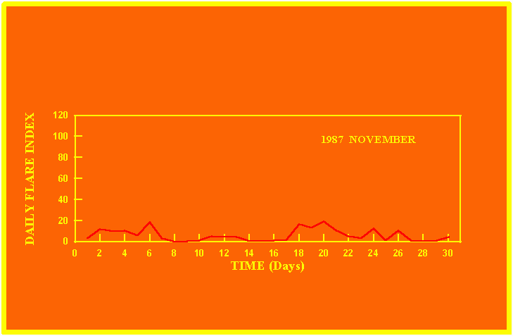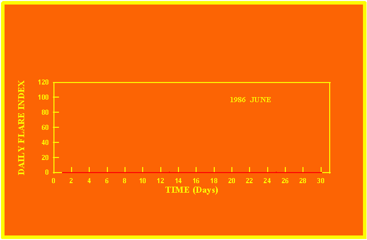 If the value of the daily flare index exceeds 20 once, then the color of that month is yellow.